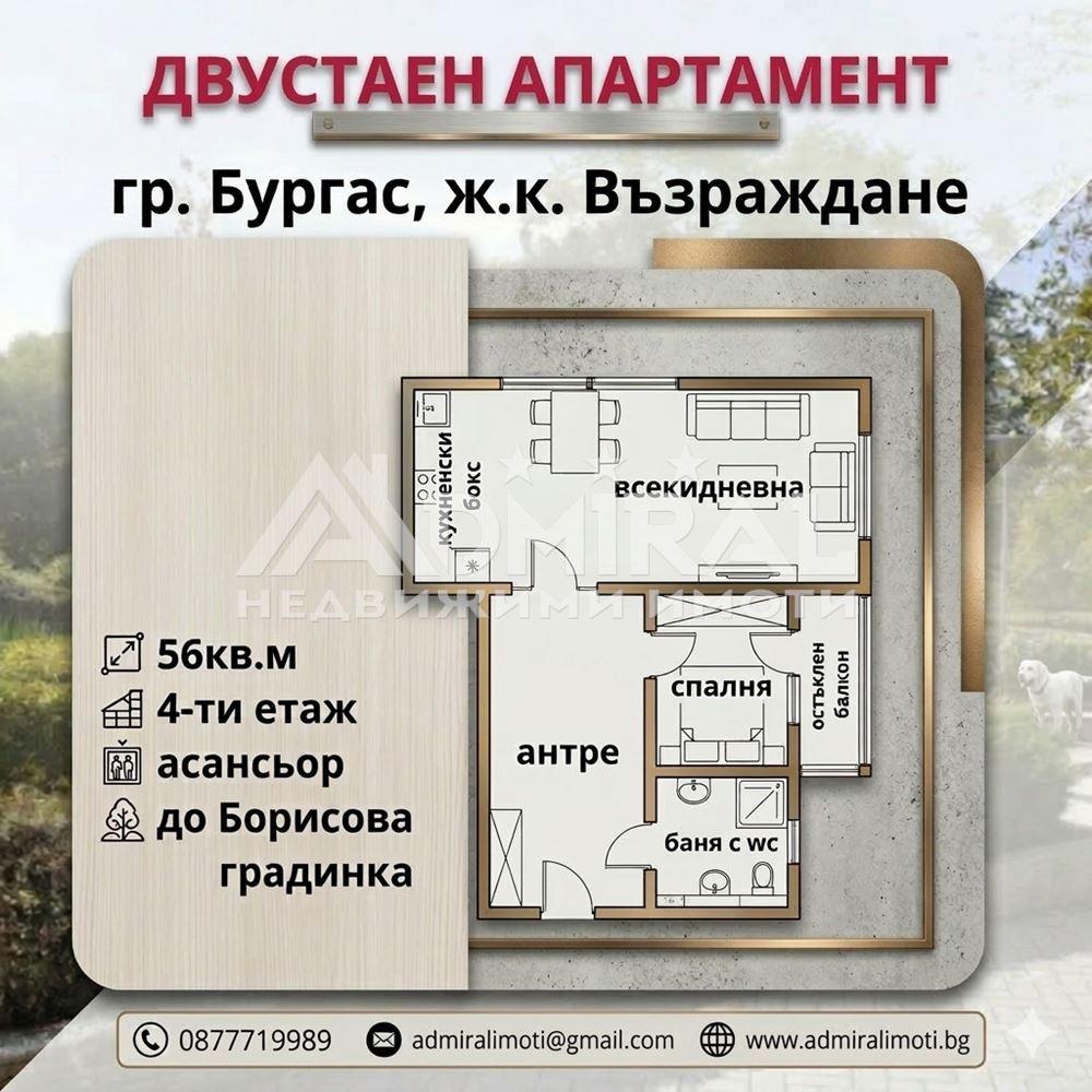 ADMIRAL НЕДВИЖИМИ ИМОТИ продава светъл и функционален двустаен апартамент, разположен в предпочитания квартал Възраждане, в непосредствена близост до Борисовата градинка – една от най-приятните зелени зони в Бургас.